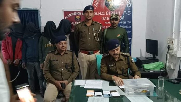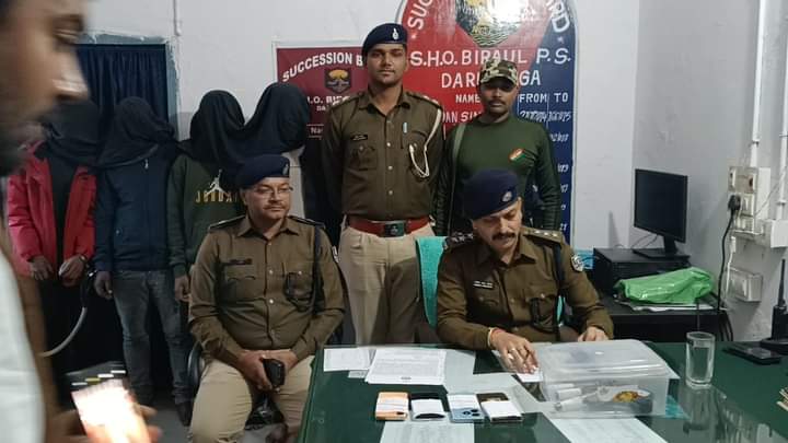 उन्होंने कहा कि गत 14 दिसंबर को संध्या में बिरौल थाना अंतर्गत खोड़ागाछी से सूचना मिली थी कि कुछ व्यक्ति इकट्ठे होकर अपराध की साजिश रच रहे हैं। सूचना के सत्यापन के लिए एसआई अखिलेश कुमार सशस्त्रत्त् बल के साथ वहां पहुंचे तो कुछ व्यक्ति भागने लगे। सशस्त्रत्त् बल के सहयोग से चार लोगों को पकड़ा गया जबकि एक व्यक्ति भाग निकला। पकड़ाए लोगों की तलाशी ली गई तो कुशेश्वरस्थान के कुबोटन निवासी सुभाष कुमार उर्फ महाकाल की कमर से एक लोडेड कट्टा व बिरौल थाने के बलिया निवासी नजमे आलम के पास से एक लोडेड कट्टा मिला। वहीं, साहो गांव के बिपिन कुमार की कमर से एक कट्टा एवं कुशेश्वरस्थान के गुलशन कुमार के पास से चार मोबाईल फोन मिले। इस संदर्भ में बिरौल थाने में कांड दर्ज है। एसडीपीओ श्री चौधरी ने बताया कि पूछताछ में इन लोगों ने बताया कि एक दिसंबर को नौडेगा रोड में विपिन राम व नजमे आलम ने फायरिंग कर एक व्यक्ति से मोबाईल लूटा था। बरामद मोबाईल वही है। इस संदर्भ में बिरौल थाने में कांड दर्ज है। साथ ही 11 दिसंबर को डुमरी रेलवे गुमटी के पास विपिन राम व नजमे आलम एवं धीरज कुमार, हसनपुर, समस्तीपुर ने एक लड़के से हथियार के बल पर मोबाईल, हनुमानी व एक हजार रुपये लूट लिये थे। यह वही मोबाईल है। हनुमानी व पैसा धीरज के पास है। इस संदर्भ में बिरौल थाने में कांड दर्ज है। इन लोगों का भी पूर्व अपराधिक इतिहास है। एसडीपीओ ने बताया कि सभी को न्यायिक हिरासत में भेजा जा रहा है। गिरफ्तार बदमाशों के पास से तीन कट्टा, दो कारतूस, चार मोबाईल व एक बाइक बरामद की गयी है।