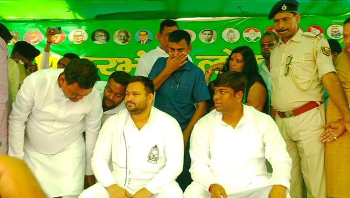कहा है, लेकिन मैं कमर में बेल्ट लगा कर एवं सुई लेकर आप से मिलने आया हूं। तेजस्वी ने कहा कि जबतक मोदी को सत्ता से हटाएंगे नहीं, तब तक बेड रेस्ट नहीं करेंगें। अभी संविधान पर खतरा उत्पन्न हो गया है। वे